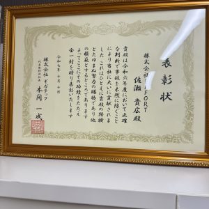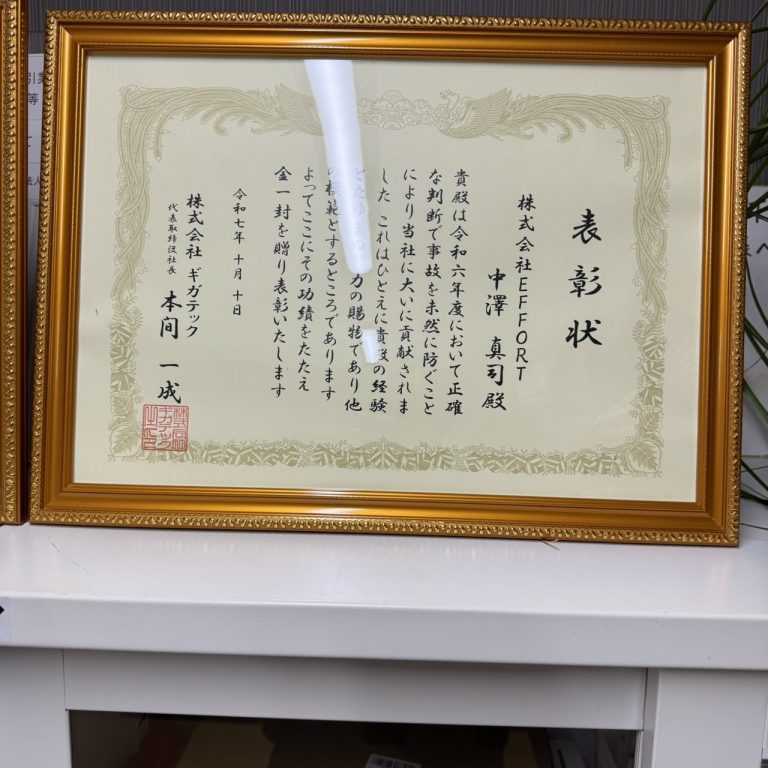 先日お知らせに掲載しましたギガテック様優良企業賞で、個人の表彰へ弊社作業員2名が選抜されました。弊社作業員の日頃の努力を評価して頂き、大変有難く思います。尚、ギガテック様より「選抜は2名ですが、全員を表彰したいです。」との大変嬉しいお言葉も頂きました。今回の表彰や頂いたお言葉を胸に、これからも安全・安心・便利を皆さまにお届けするため、社員一同、より一層精進して参ります。